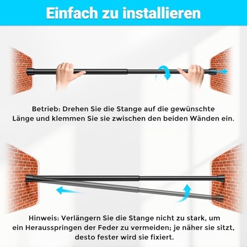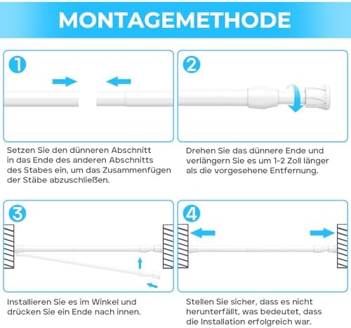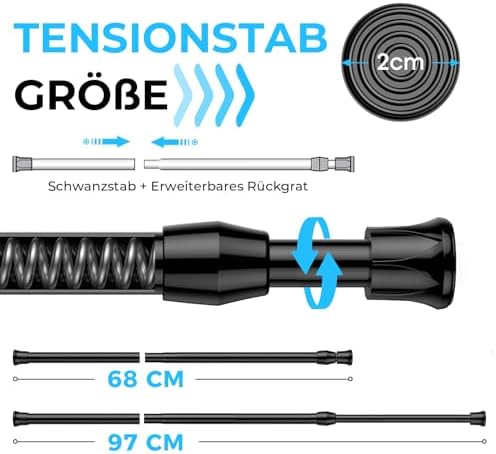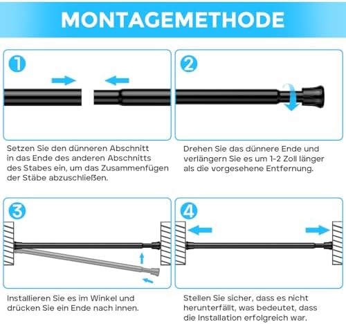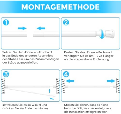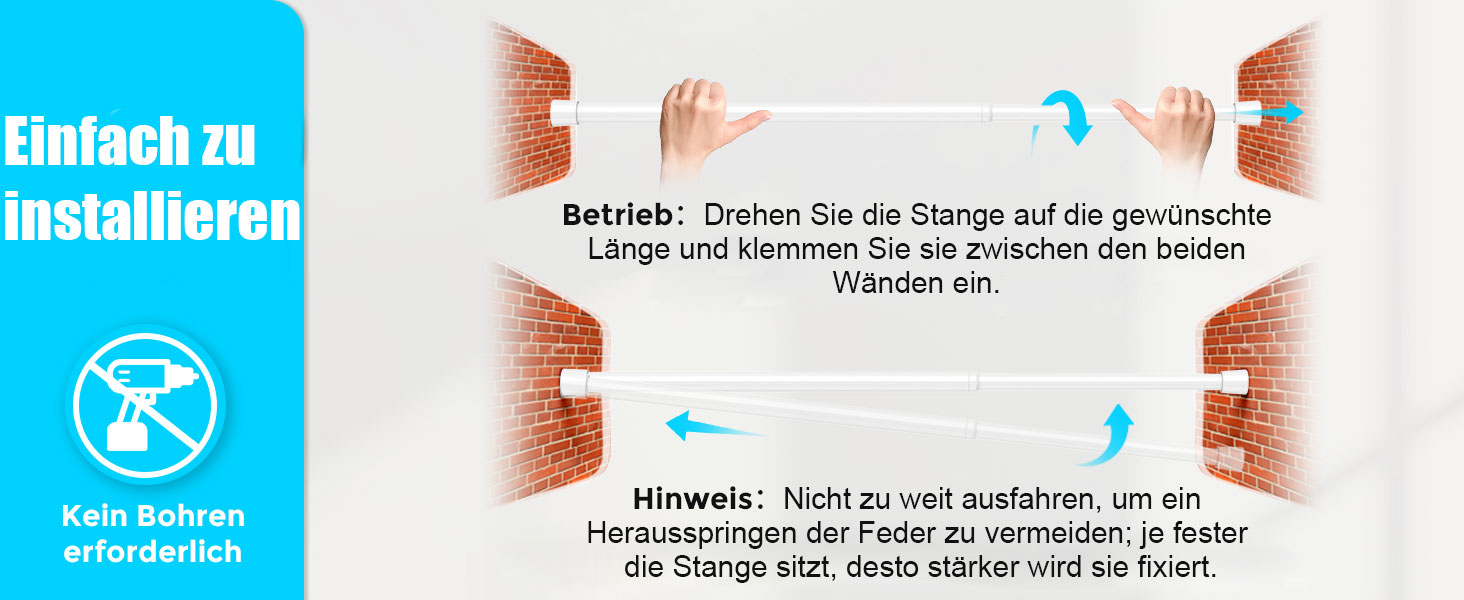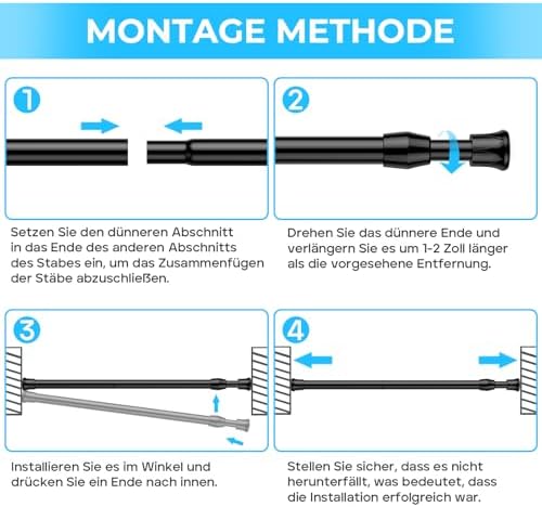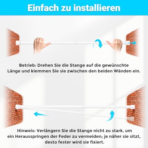 Die Montage unserer Gardinenstangen ist denkbar einfach! Sie können die Stange mühelos auf die gewünschte Länge dehnen, indem Sie sie einfach drehen. Beachten Sie bitte, dass die Stangen in zwei Teilen geliefert werden, die miteinander verbunden sind. Mit den integrierten Anti-Rutsch-Pads wird die Handhabung zusätzlich erleichtert.