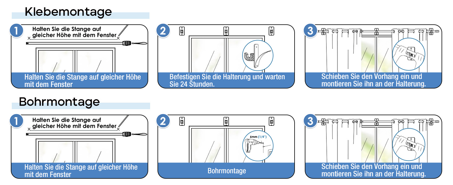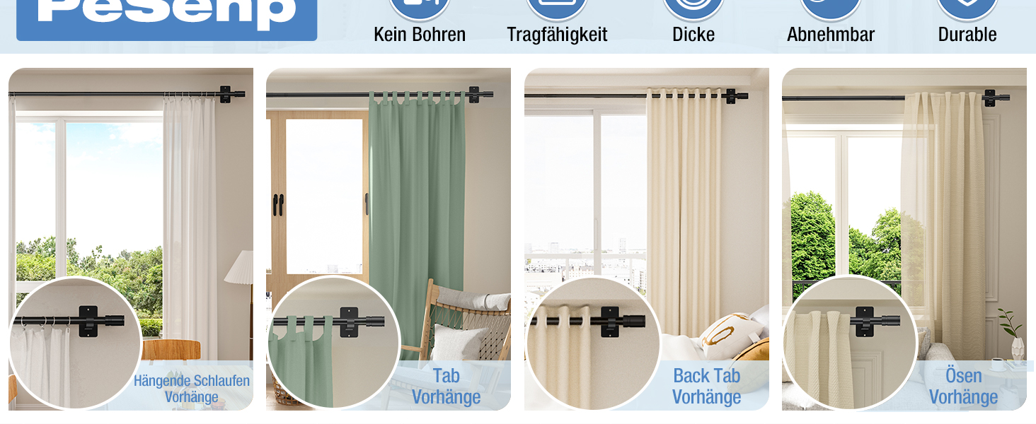 Die PeSenp Gardinenstange bietet eine einzigartige Möglichkeit, Ihre Fenster stilvoll zu dekorieren, ohne dabei Löcher in Ihre Wände zu bohren. Ausgestattet mit hochqualitativen 3m-Klebebändern und Klebefestigungen, ist die Montage kinderleicht und ideal für Mieter oder alle, die auf Flexibilität Wert legen. Genießen Sie ein schönes Ambiente in Ihrem Zuhause, ohne aufwendige Installationen durchführen zu müssen.