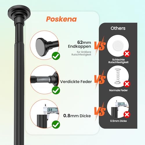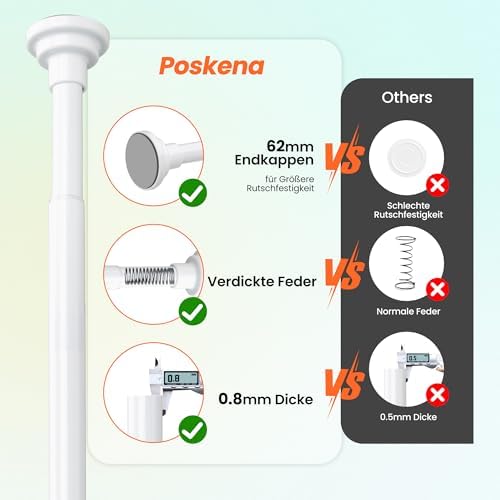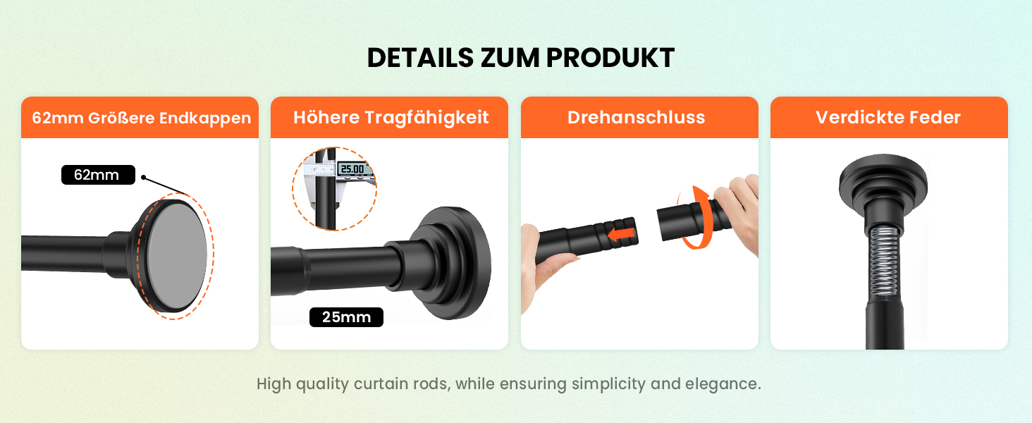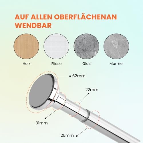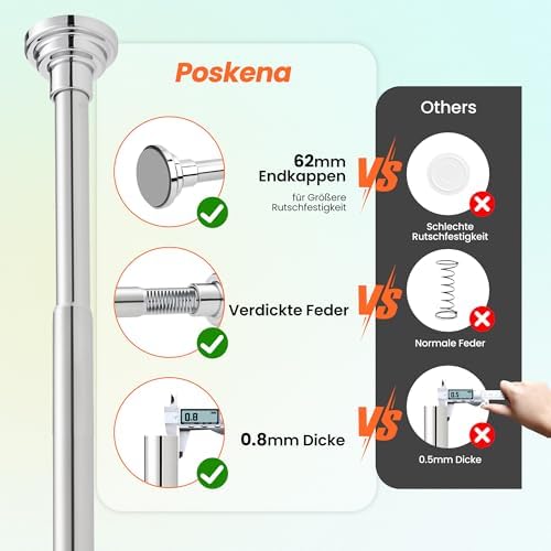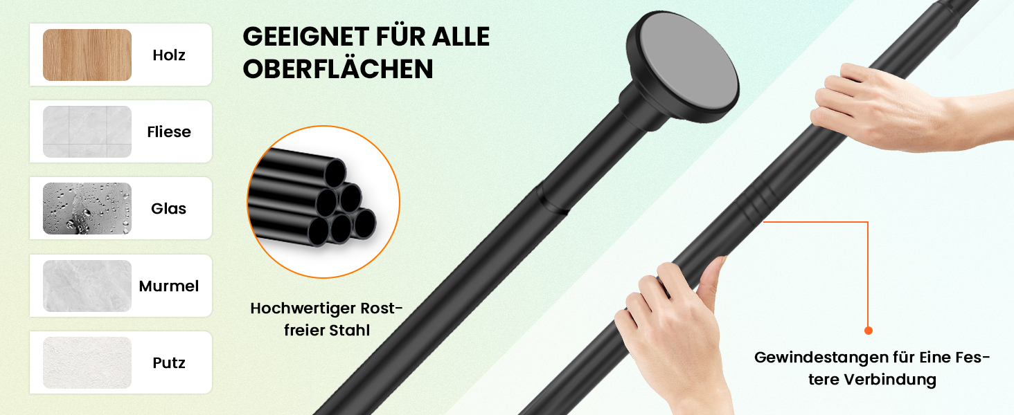 Unsere Duschvorhangstange überzeugt durch ihr starkes und langlebiges Material. Mit einem Durchmesser von 25 mm besteht sie aus hochwertigem Edelstahl, der nicht nur wasserdicht, sondern auch rostfrei ist. Der teleskopische Teil ist mit verdickten Federn ausgestattet, die ein hohes Gewicht sicher tragen können, ohne dass die Stange verrutscht. Diese Materialeigenschaften garantieren Ihnen eine langfristige Nutzung, ohne Abnutzungserscheinungen.