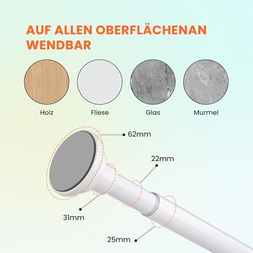 Das Design der Duschvorhangstange ist ein echtes Highlight. Der Endteil ist mit einer großen, rutschfesten Gummischeibe ausgestattet. Diese sorgt für eine außergewöhnliche Stabilität und verhindert ein Verrutschen der Stange, unabhängig von der Oberfläche, auf der sie montiert wird. Um die bestmögliche Passform zu gewährleisten, empfehlen wir, die benötigte Länge genau zu messen und eine Größe zu wählen, die 3-5 cm länger ist.