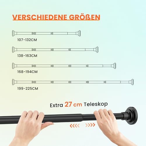 Ein herausragendes Merkmal dieser Duschvorhangstange ist die mühelose Installation. Sie benötigen keine speziellen Werkzeuge oder Bohrmaterialien, da die Stange in nur drei einfachen Schritten montiert werden kann. Das Größenverstellbereich reicht von 138-163 cm, und die Länge lässt sich schnell durch Drehen der Stange anpassen. Wählen Sie zudem aus verschiedenen Farben und Größen, die Ihren individuellen Bedürfnissen entsprechen.