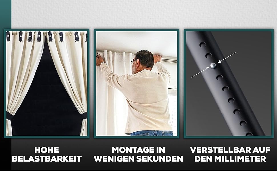 • Robuste Stahlkonstruktion: Hohe Stabilität, um auch schwere Vorhänge sicher zu halten, perfekt für anspruchsvolle Anwender.