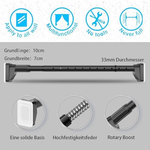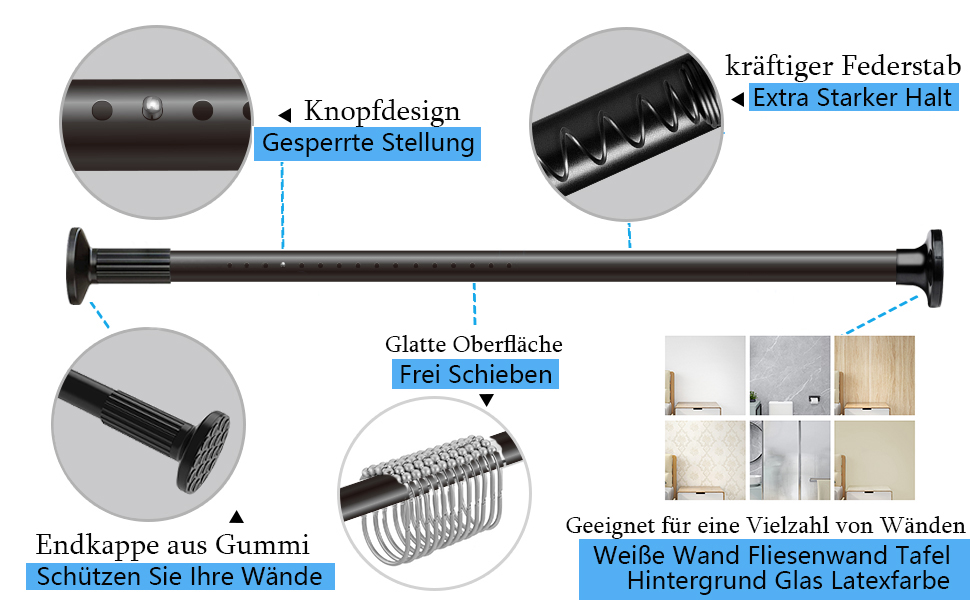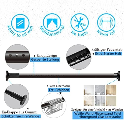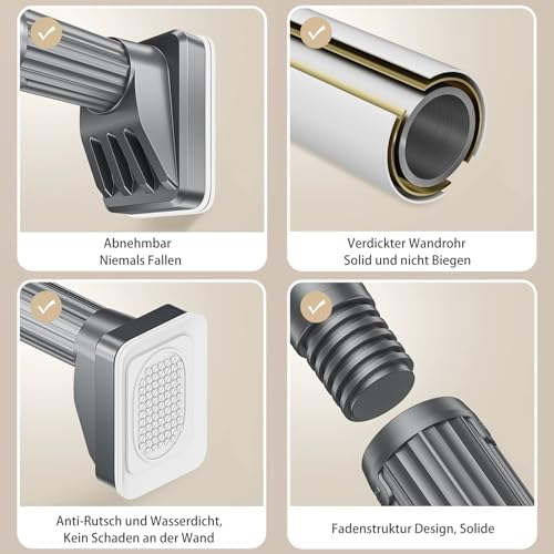 Unsere Teleskopstangen sind nicht nur auf das Badezimmer beschränkt. Sie eignen sich hervorragend für verschiedene Bereiche in Ihrem Zuhause: ob in der Küche, im Schlafzimmer, in der Garderobe oder an Türen und Fenstern. Sie können sie auf glatten oder rauen Oberflächen wie Holz, Tapete, Fliesen, Zement oder Keramik verwenden, was sie extrem vielseitig macht.