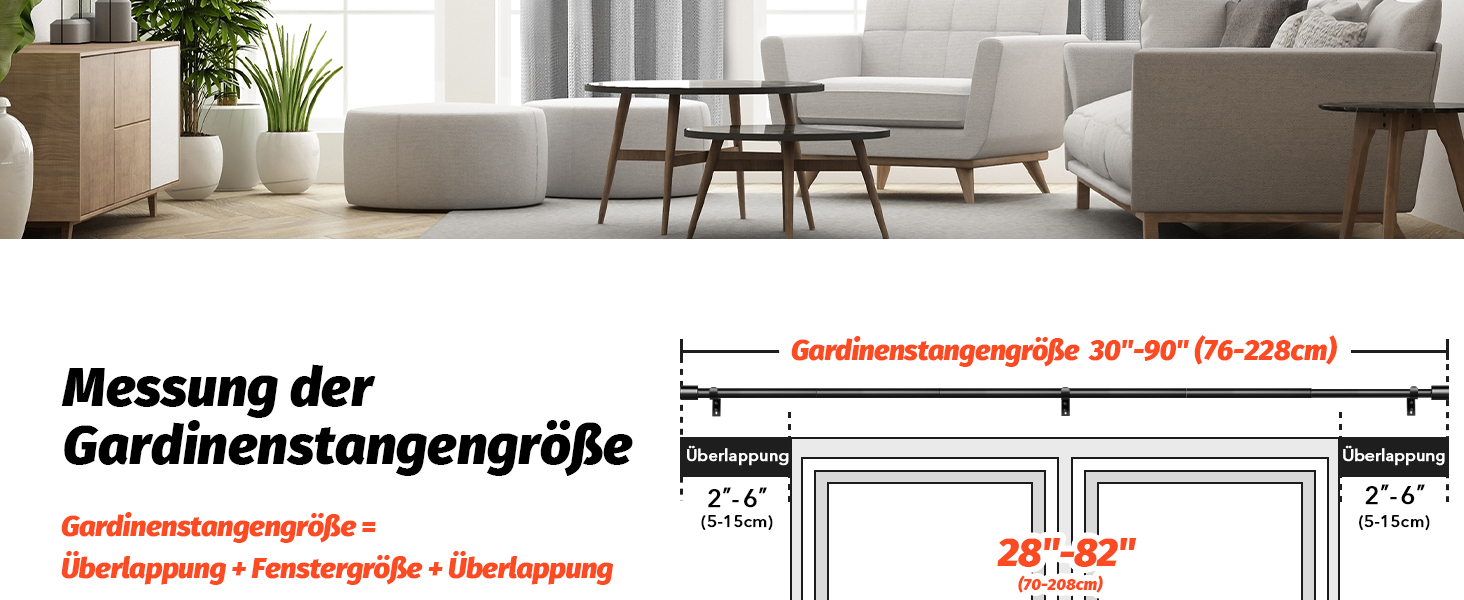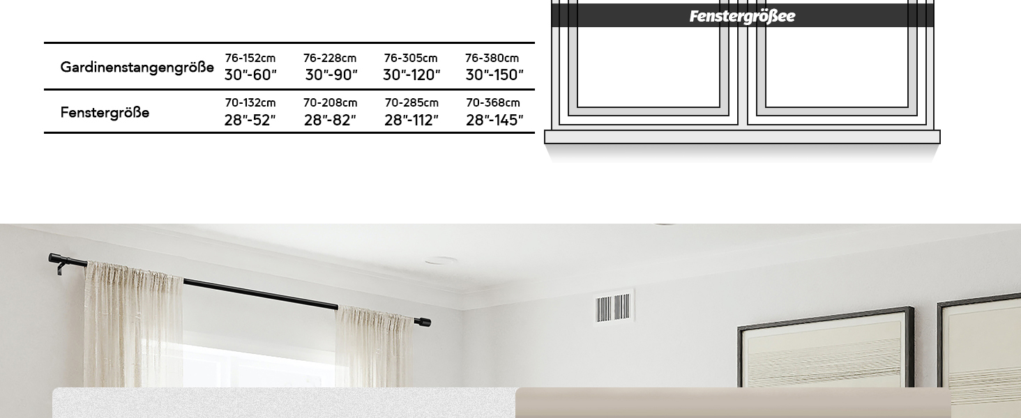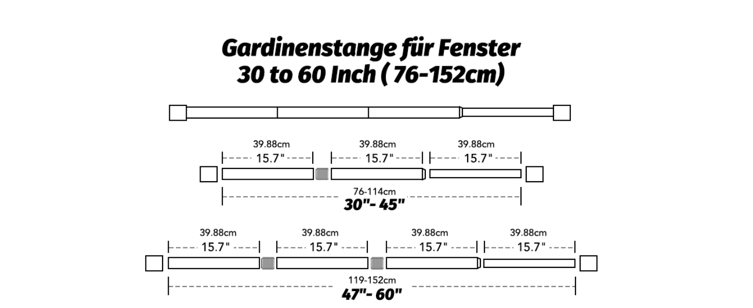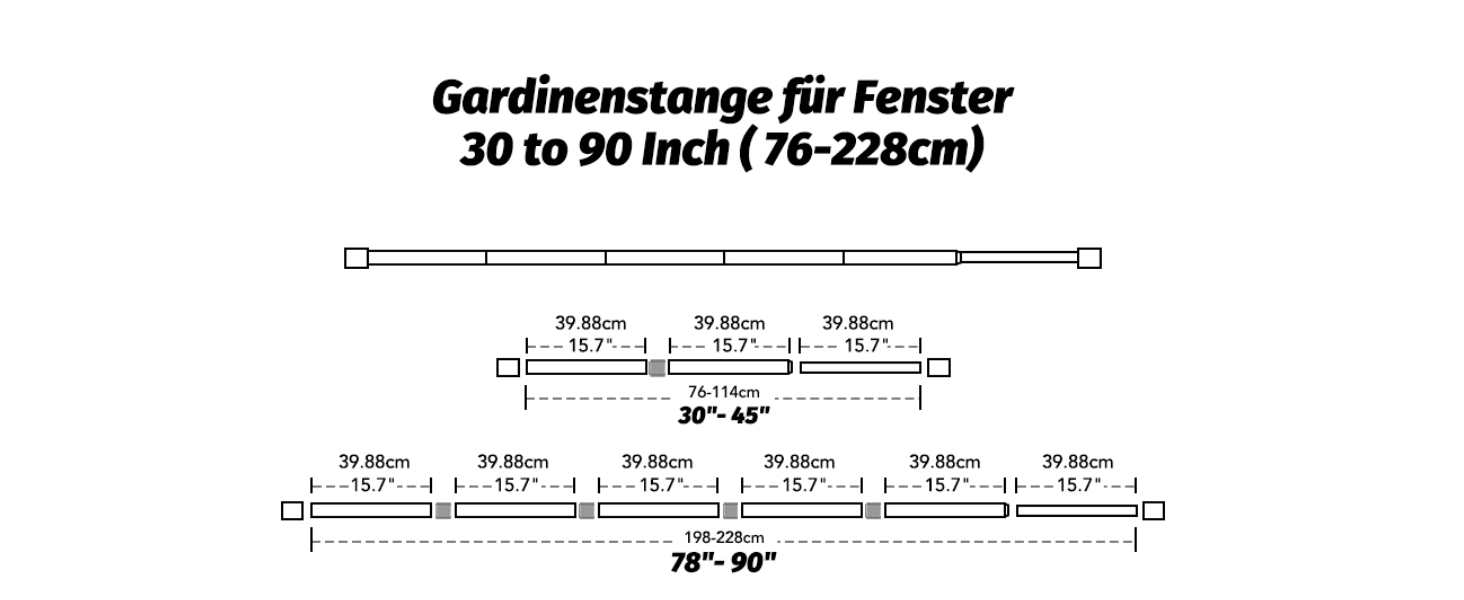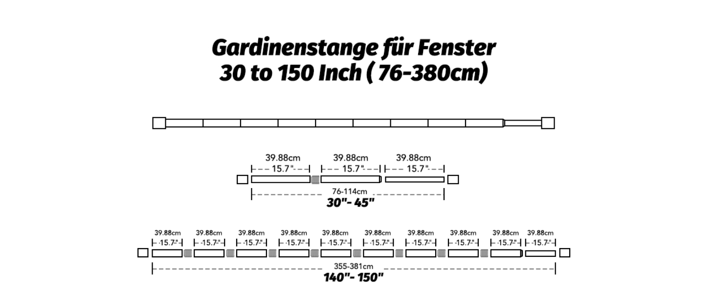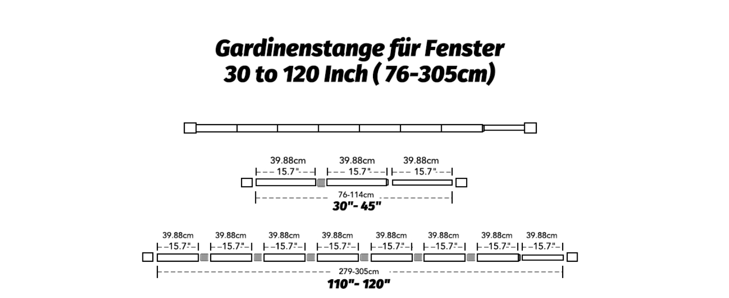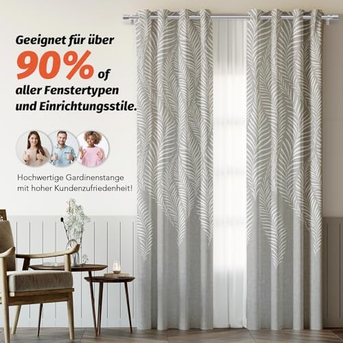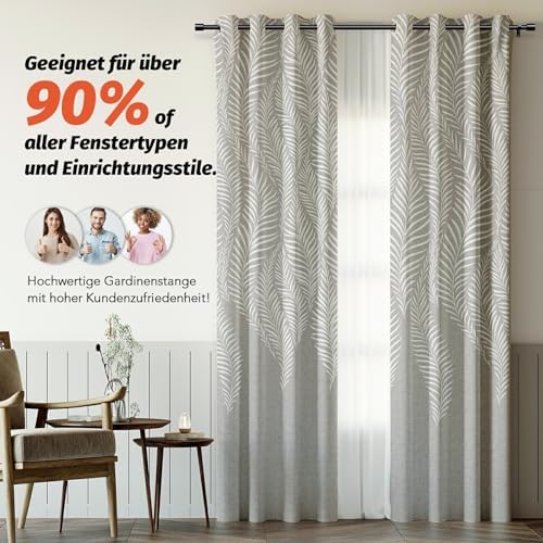 Die verstellbaren Halterungen ermöglichen eine problemlose Anpassung an verschiedene Fenstergrößen von 76 bis 228 cm, wodurch auch kleine Messfehler perfekt ausgeglichen werden können. Die Endstücke der Gardinenstangen sind elegant und modern gestaltet und verleihen Ihrem Interieur das gewisse Etwas. Diese stilvollen Stangen sind nicht nur für das Wohnzimmer geeignet, sondern finden auch im Schlafzimmer, der Küche oder auf der Terrasse ihren Platz.
